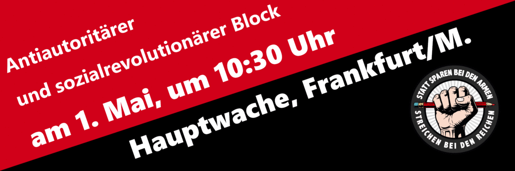 Im Rahmen der diesjährigen allgemeinen Erste-Mai-Demonstration ruft die Gewerkschaft Freie Arbeiter*innen Union Frankfurt zu einem antiautoritären und sozialrevolutionären Block auf, der sich gegen das einseitige Spardiktat der Bundesregierung richtet.